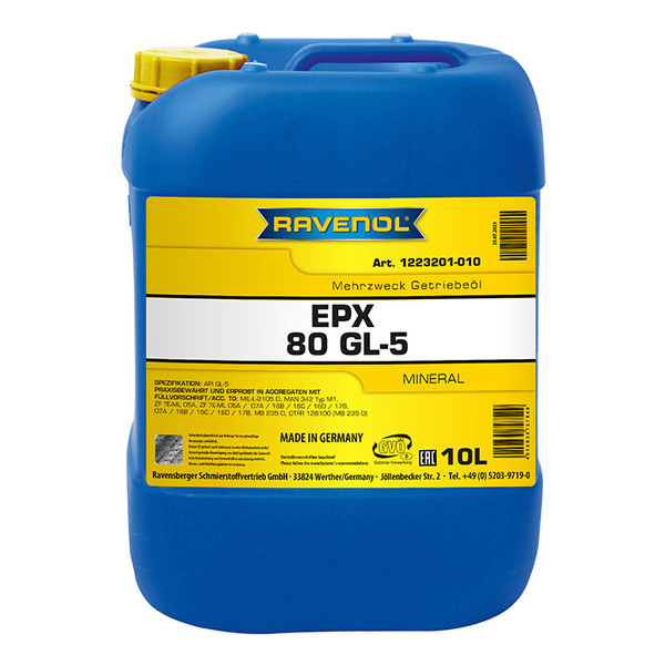 RAVENOL Getriebeoel EPX SAE 80 GL 5 guarantees due to the balanced additive combination characteristics like a high pressure absorption capacity, a superior viscosity temperature behaviour, a high oxidation stability, low pour points, a good corrosion protection and non-sludging.