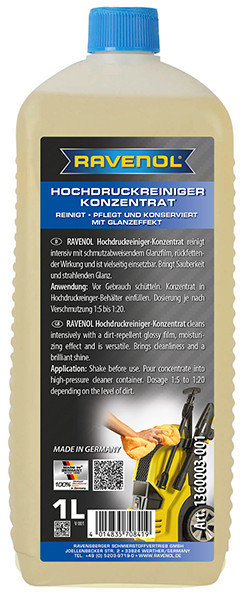 RAVENOL Hochdruckreiniger-Konzentrat is a versatile, high quality, pressure washer concentrate suitable for use on vehicles of all types including motorcycles and mopeds, as well as for effective cleaning of rubber flooring, stone and flagged flooring, patios, tarpaulins, awnings, plastics, tiles and more.