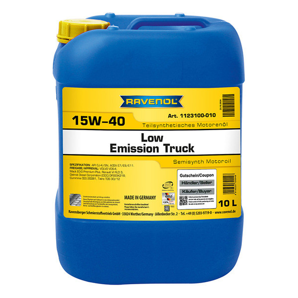 RAVENOL Low Emission Truck SAE 15W-40 –  yarim sintetik yuk avtomobillari uchun API CJ-4 sinfidagi motor moyi, past kul tarkibli qo‘shimchalar Low SAPS (past sulfat kul, fosfor va oltingugurt miqdori) paketi bilan, 2007-yildan keyingi avtomobillarda qo‘llash uchun mo‘ljallangan.