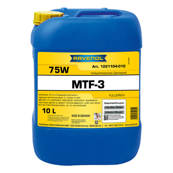 RAVENOL MTF-3 SAE 75W to‘liq sintetik transmissiya moyi bo‘lib, uzatmalar qutilari, razdatka qutilari va differensiallar uchun mo‘ljallangan.