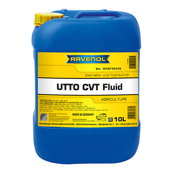 RAVENOL UTTO CVT Fluid is a combined transmission and hydraulic oil for agricultural, forestry and construction machinery. It is a special developed universal oil which can be used in combined hydraulic and transmission systems as well as in wet brakes in modern machines. High quality base oils and selected additives guarantee trouble-free operation of all aggregates at at any seasons.